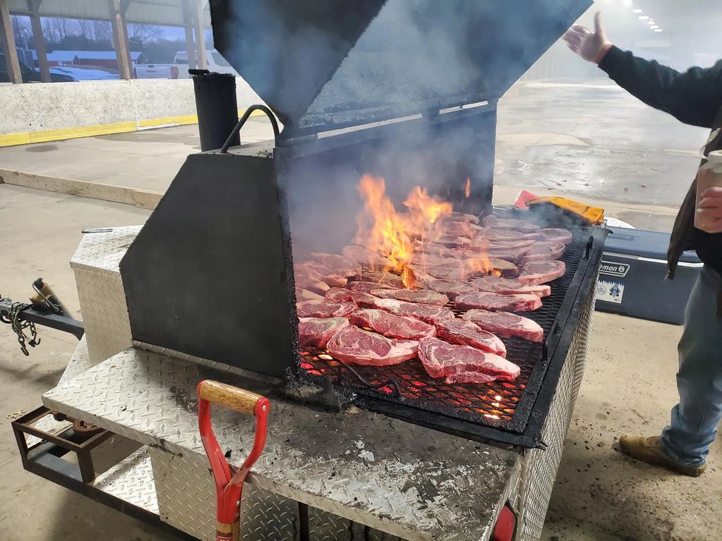 About 50 1lb Boneless Ribeyes on the grill.