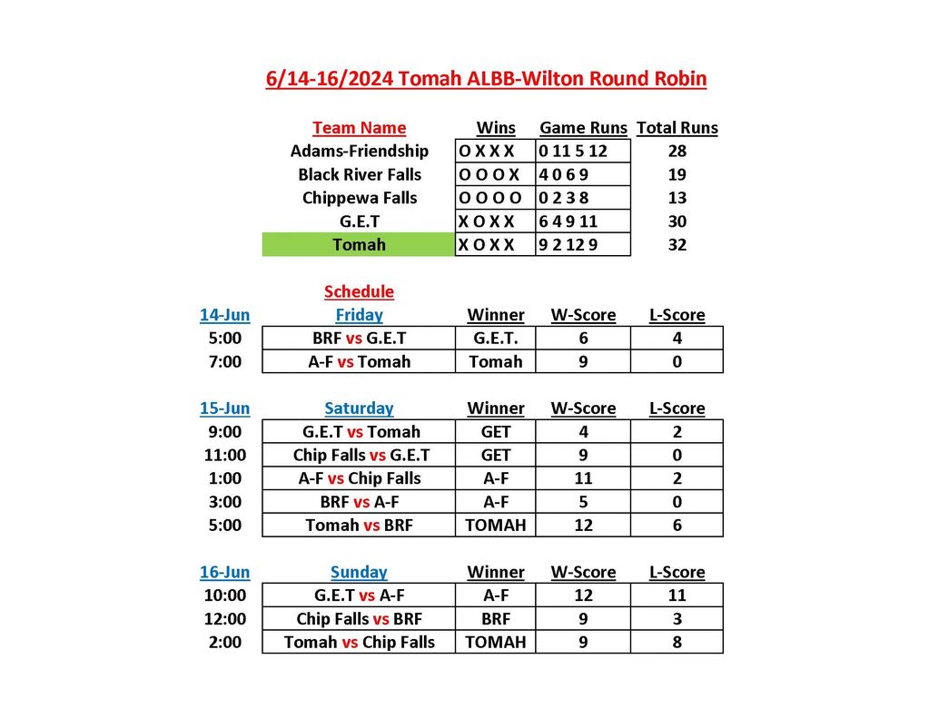 2024 Wilton 16U Tournament. Sponsored by Tomah American Legion Baseball. Hosted by the City of Wilton & Wilton American Legion Post 508. Winner: Tomah 16U, Record 3 - 4, Total Runs: 32